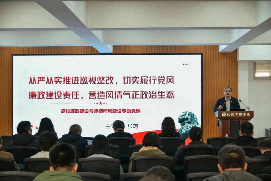 工作部署会议后,张珂校长以《从严从实推进巡视整改,切实履行党风廉政建设责任,营造风清气正政治生态》为主题,为全院教职工讲授专题廉洁党课。他强调,巡视整改是学校当前和今后一个时期的重要政治任务,全校上下要进一步提高政治站位,深刻认识巡视整改的重要意义,以高度的责任感和使命感推进巡视整改工作落实落细。张校长指出,党风廉政建设是学校高质量发展的根本保障,全体教职工应强化责任担当,坚决杜绝形式主义和官僚主义,确保各项工作取得实效。张校长还特别强调,要加强科研诚信建设,营造良好的学术氛围。