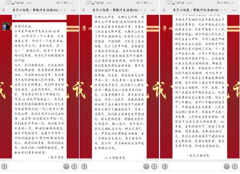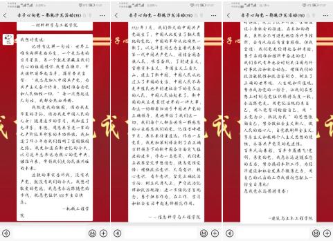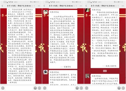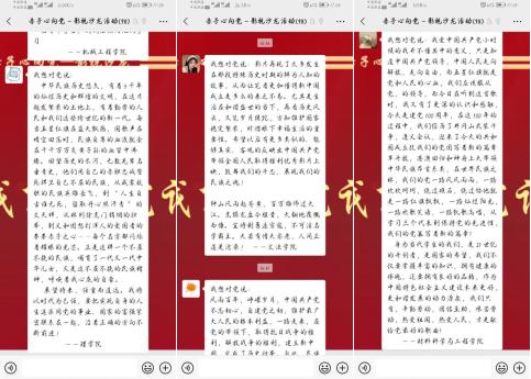 历史风云激荡,红旗招展如画。经过此次影视沙龙活动,忆往昔峥嵘岁月,同学们积极响应,为党留言献礼,立志去扛起那面鲜艳的中国共产党党旗,以积极心态面对青年的责任,担当起建设党与国家的重任,在新时代长征路上经风雨、壮筋骨,行稳致远。