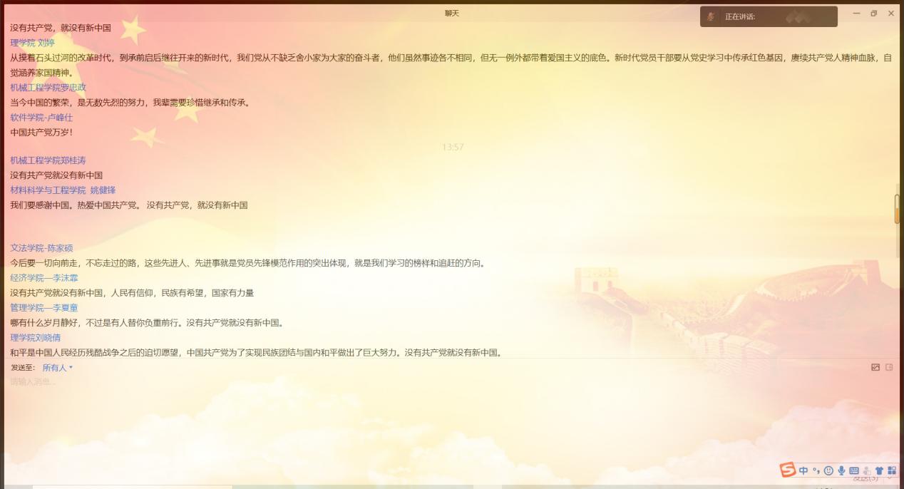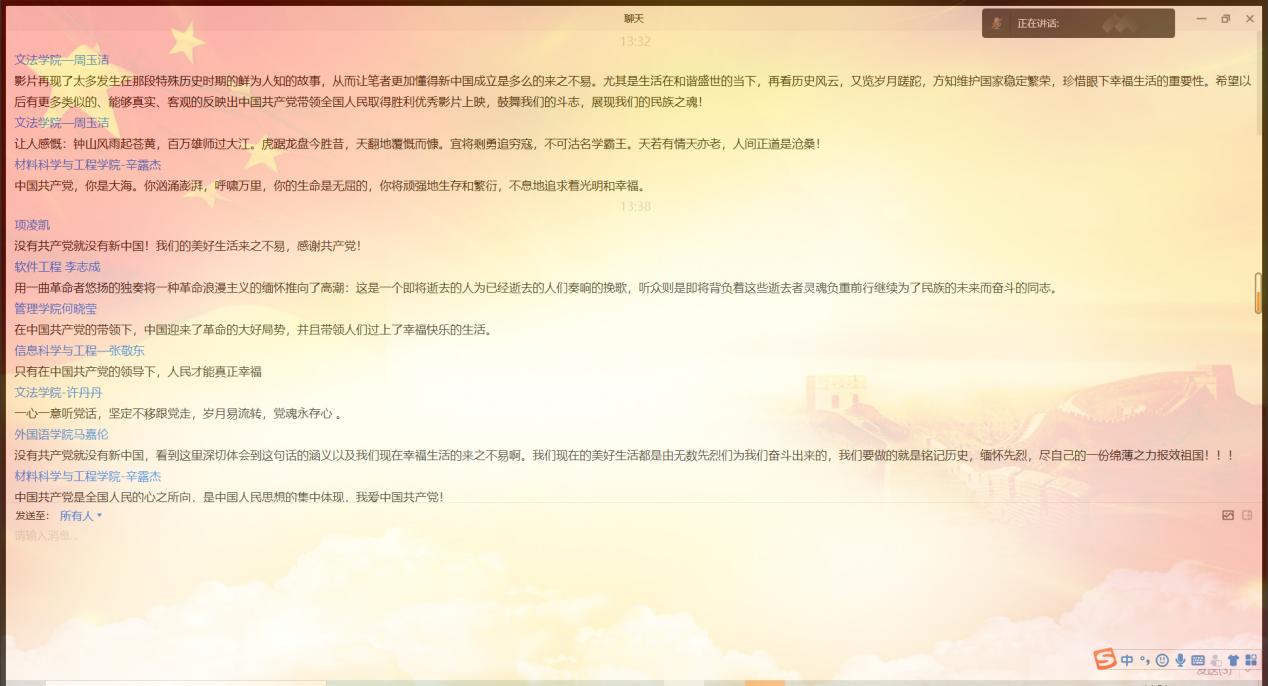 观影结束后,为献礼中国共产党百年华诞,进行本次活动的特色环节“我想对党说”。部分同学将自己想要对党说的话写到明信片上,通过思想转变为文字的过程,让自己对于党的新体悟更加清晰。还有部分同学将自己想对党说的话,发布在微信交流群中,同样表达了对党深深的祝福。并且有几位积极的学生代表打开了麦克风、摄像头与大家分享了他们想对党说的话。