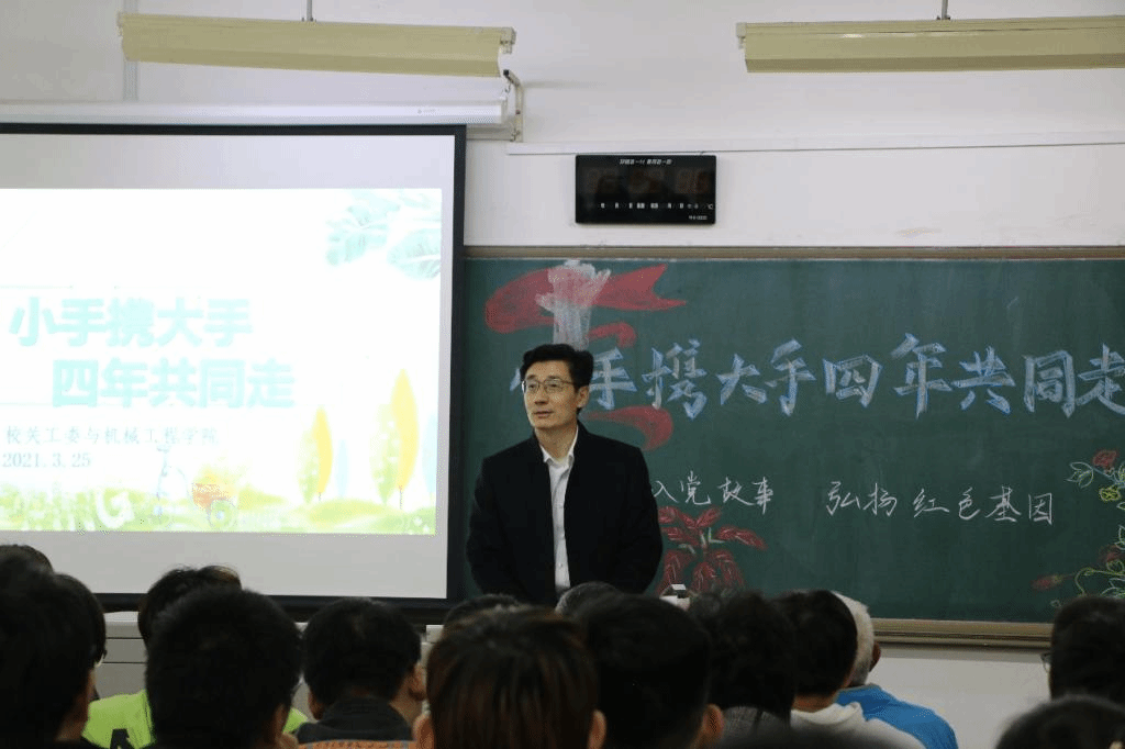 2021年3月25日下午,“小手携大手,四年共同走”特色班会在公共教学楼C座101教室举行。原机械工程系党总支书记、6776永利集团副校长、党委副书记于秋恩老师,原6776永利集团基础部主任、教授俞秉义老师,yl6776永利集团党委书记曲弋老师,yl6776永利集团党委副书记、副院长孙健老师,yl6776永利集团团委书记陆鑫老师,2018级机自专业辅导员夏怡老师以及机自专业学生干部代表、机自1807班全体同学参加本次活动。本次活动由陆鑫老师主持。