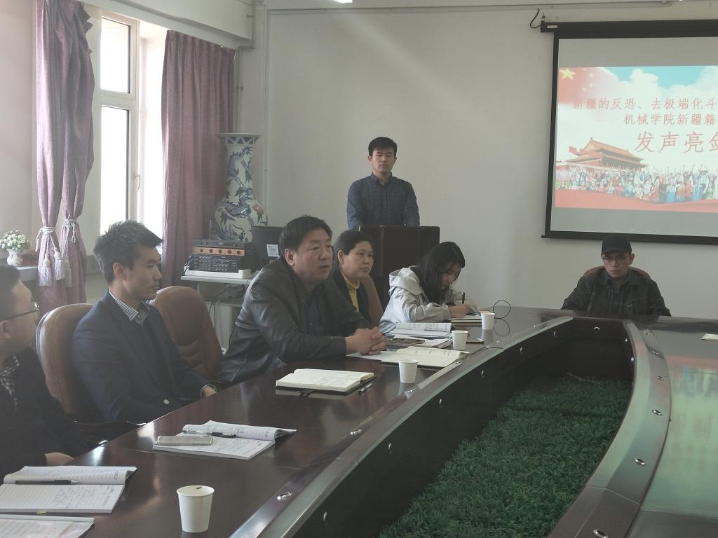 为深入贯彻落实学校开展的“新疆反恐、去极端化斗争与人权保障”为主题的专题教育活动,增强新疆少数民族同学的政治纪律意识及自觉抵制和防范宗教极端化思想渗透意识,坚定政治信念,维护和执行中央对新疆的治疆方略,同时根据学校要求,机械学院特于4月11日,在机械楼312举行学生亮剑座谈会。yl6776永利集团党委副书记兼副院长孙健,新疆维吾尔自治区教育厅内派教师张砺君、康红霞、热米兰木,以及全体辅导员出席大会,会议由学院新疆籍少数民族学生管理专员石卿志主持。